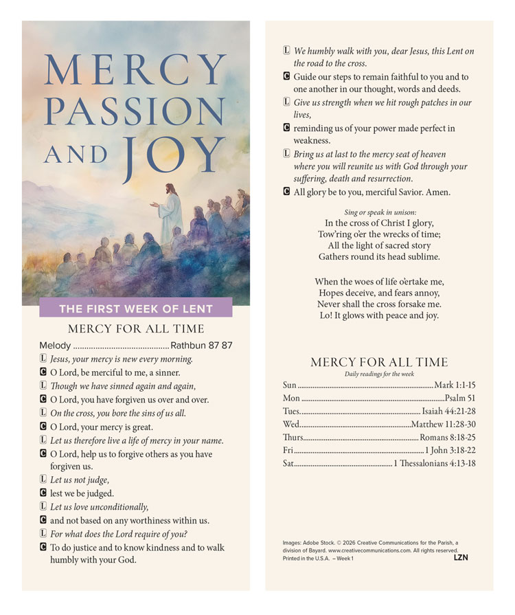 This series of six Lenten litanies—one for each Sunday of Lent—highlights the various aspects of mercy, passion and joy found in story of Christ and the cross. Includes responsive spoken words, hymn verses and daily Bible verses on each week’s theme related to this trio of Lenten characteristics. For use with the Lent devotional booklet (MR5) of the same name or alone.